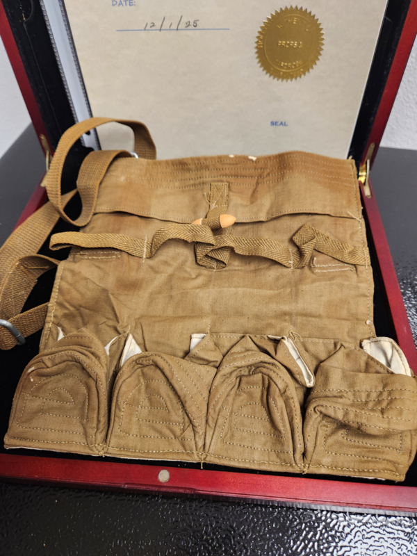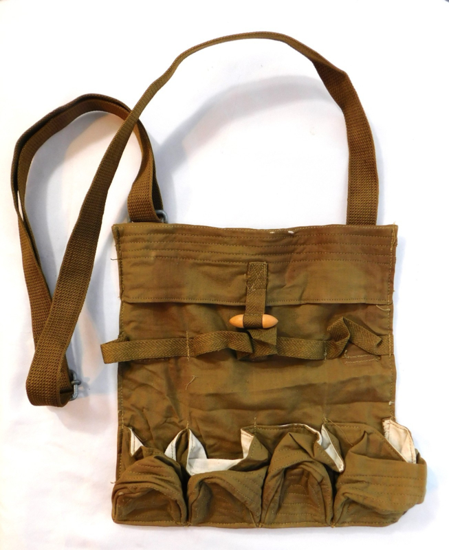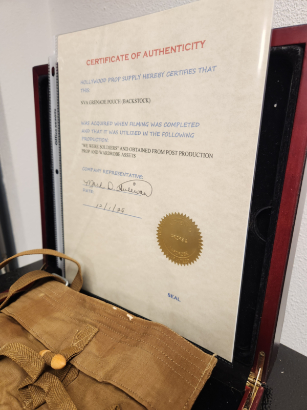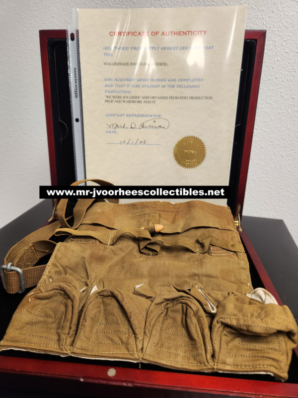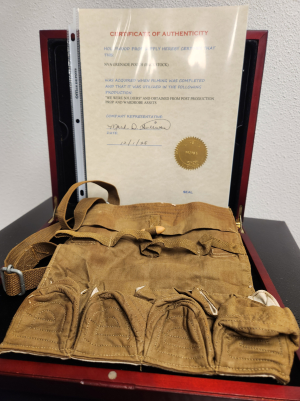 THIS ITEM IS AN OD GREEN NVA GRENADE POUCH THAT WAS PART OF THE "WE WERE SOLDIERS" PRODUCTION ASSETS THAT WERE BACKSTOCK. THE GRENADE POUCH FEATURES A FULLY ADJUSTABLE CARRY STRAP AND ACCOMODATES 4 GRENADES.