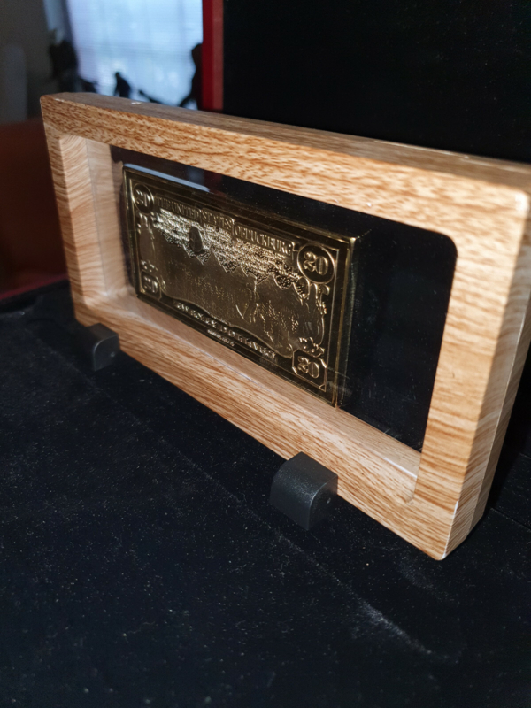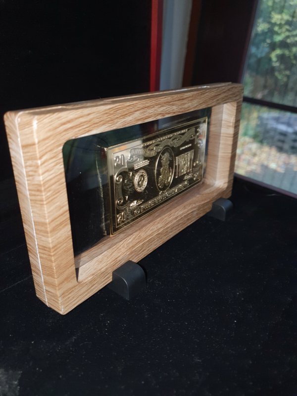 In good condition, With on the frontside the text "Walt Disney Twenty Dollar Banknote Brass/Gold Limited Edition: Goldrush Klondike Alaska USA, on the backside you see Scrooge Mcduck Looking over the Klondike with a bag of gold and the text "IN GOLD WE TRUST".
